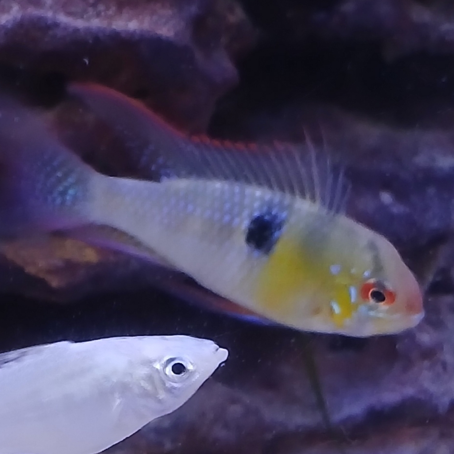 Mikrogeophagus ramirezi, commonly known as the German Blue Ram, is a small, colorful freshwater fish native to the Orinoco River basin in South America. This species is prized for its vibrant coloration and relatively peaceful temperament. The Ram exhibits a laterally compressed body shape with a striking array of colors, including iridescent blues, yellows, and oranges. The dorsal fin is typically elongated and may feature extended rays. Although generally peaceful, they can exhibit territorial behavior, especially during breeding. They thrive in well-maintained aquariums with stable water parameters. A varied diet of high-quality flake food, small granules, and occasional live or frozen foods such as bloodworms and daphnia is recommended. German Blue Rams are best kept in pairs or small groups in a spacious aquarium with plenty of hiding places and open swimming areas. Soft, slightly acidic water is ideal for their well-being.